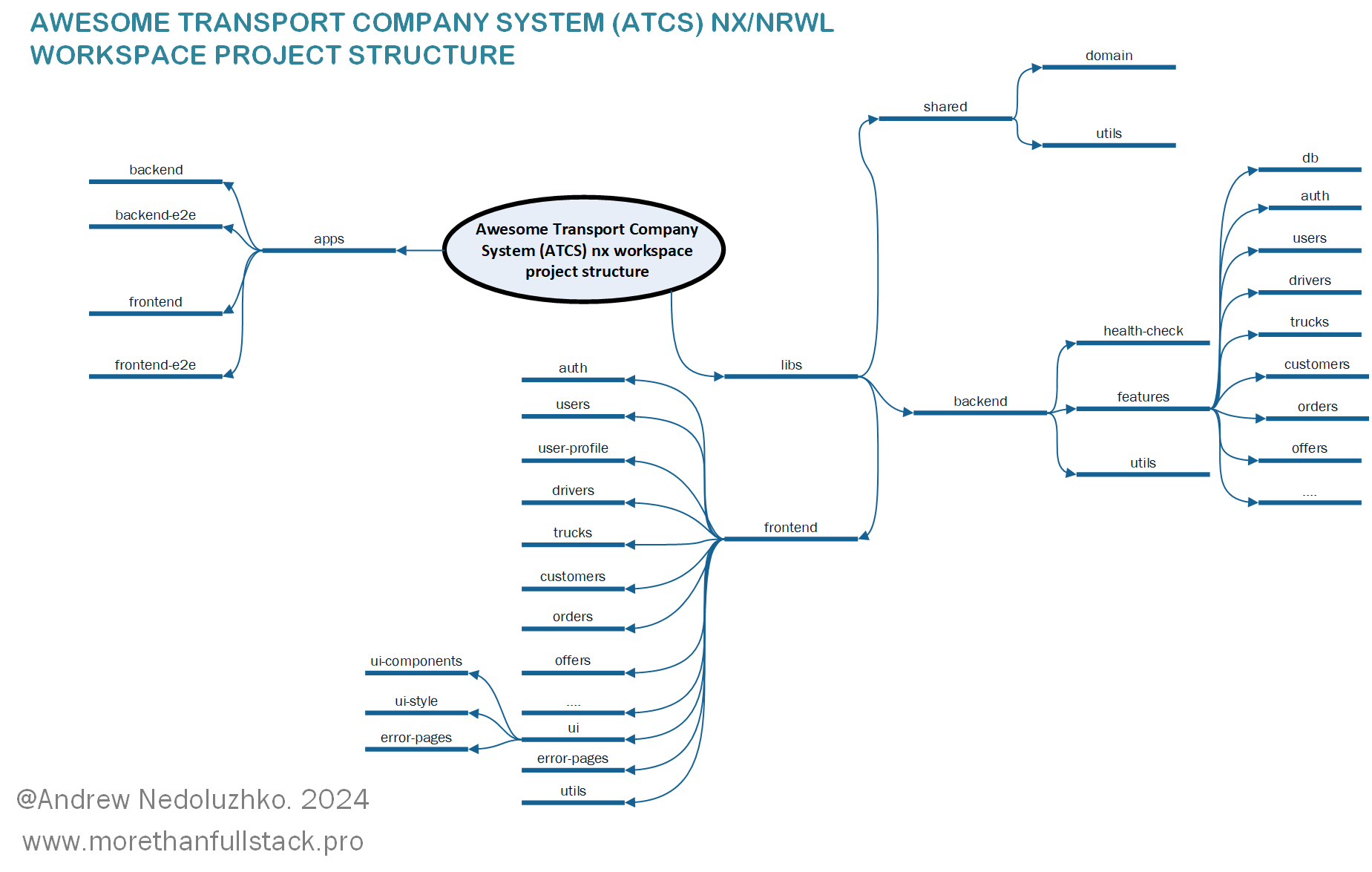 • Backend app will be developed in one library because we develop solution using realtional data model based on TypeORM where all entities are joined based on defined domain model. That is why I don’t see the point in implementing functionality with linked entities as set of separated libraries.