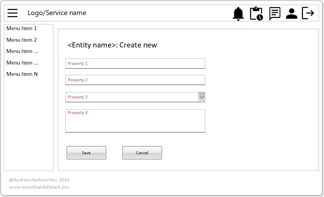 The standard forms for operations with entities data such as create or update will be look like on picture below or in a dialog window style