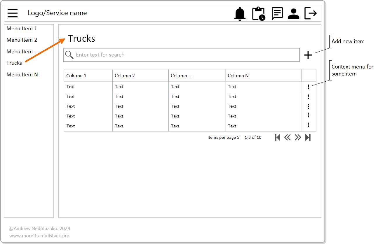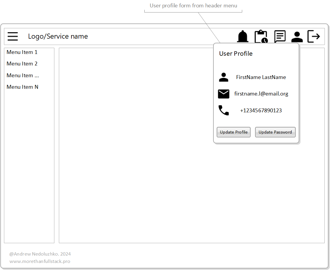 In the header we will use toolbar menu with icons and menu forms like picture below